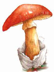 Les lamelles sont jaune doré. Le pied robuste (jusqu'à 15 cm), jaune clair à doré, charnu, cylindrique devient plus épais à la base, s'engageant dans une volve membraneuse blanche. Il possède un anneau strié, large, rabattu, de couleur jaune orangé également. La chair épaisse, ferme et blanche mais jaune orangé en surface, a une faible odeur de noisette. Telle est l'amanite des Césars. Plutôt méridionale, cette espèce peut courante dans la vallée se trouve, parfois, lors de grandes chaleurs, de juillet à octobre. Les bois de chênes ou de châtaigniers, les lisières et les prairies bordant ceux-ci lui conviennent. Elle apprécie plus rarement mais se trouve parfois au voisinage de hêtres, bouleaux, noisetiers ou quelques conifères. Appelée aussi oronge, excellent comestible, elle peut éventuellement être confondue avec l'amanite tue-mouches, si ce n'est que cette dernière arbore un chapeau rouge à verrues blanches. |