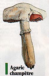 C'est le champignon des prés par excellence, cultivé sous le nom de "champignon de Paris". Des lamelles blanches devenant brunes puis noires, un pied plein, assez court (jusqu'à 7 cm), cylindrique et blanc avec un anneau membraneux et blanc, sans volve. La chair est blanche, brunissant à la cassure, et d'odeur agréable. Tel est le rosé des prés, souvent confondu avec l'agaric jaunissant, toxique, et l'amanite phalloïde mortelle. Ses cousins sont l'agaric des jachères (dont le chapeau va jusqu'à 20 cm et le pied de 10 à 15 cm), le champignon de couche, très proche, l'agaric des bois (ou rosé des bois) plus élancé que le "jachères" et l'agaric des forêts qui lui est couvert d'écailles allant du roux au brun. Il peut aussi, parfois, y avoir confusion avec la lépiote brune. Essentiellement présent dans les prairies à moutons et à chevaux (moins souvent à bovins), on trouve l'agaric champêtre après la rosée, au printemps mais surtout d'août à octobre. |
