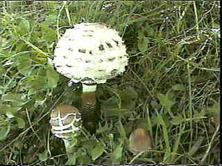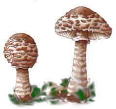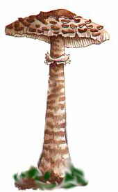 La lépiote élevée (appelée coulemelle, parasol, grande lépiote, etc) est de grande taille, arbore des lamelles blanc crème puis blanc sale (lorsque le chapeau s'aplanit) qui ne sont pas rattachées au pied. Celui-ci est grêle, long (de 20 à 30 cm, voire 40 cm pour un chapeau de 35 cm de diamètre !), pourvu d'un anneau mobile blanc au dessus et brun au dessous, laineux, et est bulbeux à la base. Il est couvert de nombreuses écailles ocre, ou brun à noirâtre. La chair est blanc rosé et d'odeur agréable.On trouve ce très bon champignon dès juillet mais surtout en septembre et octobre, en bordure de haies, de bois, ou de prés, parmi les fougères ou les genêts, dans les landes, les clairières et les prairies non entretenues. La coulemelle peut être confondue avec la lépiote brun-incarnat dont la taille est inférieure tant par le chapeau que par le pied. Cette dernière est mortelle. |