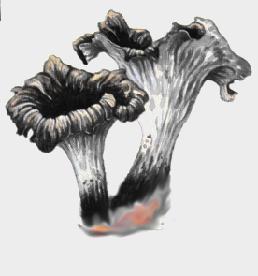 La trompette des morts est appelée aussi corne d'abondance ou craterelle. La face externe du réceptacle est ridée et d'un gris cendré à bleuté par temps sec, presque noire à l'humidité, dépourvue de lames, comme chez les autres chanterelles. Le pied tubuleux est gris cendré également puis noirâtre. La chair est mince, assez fragile. Elle pousse dans les feuillus, sous les chênes, hêtres, châtaigniers et charmes, dans les taillis de noisetiers, dans les ornières, plus rarement dans les bois de conifères. On la trouve en colonies importantes parmi les feuilles, d'octobre à fin novembre parfois même dès le mois de juin. Elle n'apparaît en grand nombre que lors d'années particulièrement pluvieuses. |