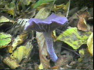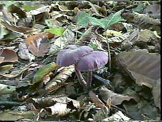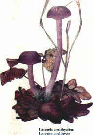 Le clitocybe améthyste possède des lames épaisses, espacées et saupoudrées de blanc à maturité : il s'agit des spores. Son pied long, mince et sinueux, de 5 à 10 cm, feutré de blanc à la base, est de même couleur que le chapeau. D'un port élégant, ce champignon se développe de l'été à l'automne. On le trouve en bandes dans les bois de feuillus ou de conifères, sur la mousse, surtout sur sol très humide. De parfum légèrement fruité, ce délicat bijou appelé communément mousseron des bois, a une saveur douce. On ne consommera pas le pied : il est trop fibreux. La confusion est possible avec l'inocybe à lames (var. lilacine) de couleur lilas mais arborant un mamelon, d'odeur désagréable et toxique. La mycène pure, au chapeau rosé ou lilas et au pied rose ou violet, toxique également et exhalant une odeur rave peut également tromper l'amateur ... Il sera donc prudent de ne ramasser que des améthystes bien violettes ! |