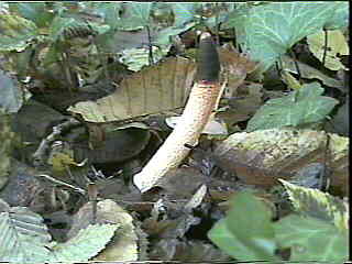 Le satyre des chiens est particulièrement facile à reconnaître ! Se dressant parmi les feuilles mortes pendant deux à trois jours, il retombe ensuite mollement, comme fatigué ... Le corps blanc-rosé à légèrement jaunâtre, d'un diamètre n'excédant pas 1,5 cm, tranche dans les sous-bois, quoique n'atteignant que rarement 15 cm. Exhalant à maturité une odeur nauséabonde, il n'a toutefois pas le "caractère" aussi prononcé que son cousin le "puant". Il n'a d'intérêt que par son port surprenant et n'est d'ailleurs pas comestible. |