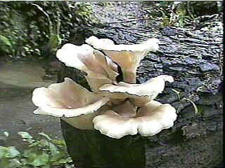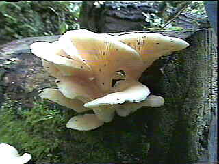 La pleurote corne d'abondance ne passe pas inaperçue tant sa couleur et sa poussée en touffes tranche dans les sous-bois. Les lames décurrentes descendent jusqu'à la base du pied. Ceux-ci, relativement excentrés, soudés à la base forment la touffe d'une espèce se développant durant tout l'été sur les souches de feuillus divers tels que peupliers, ormes, saules, etc., dans les parties humides, souvent près de ruisseaux. Il s'agit là d'un très bon comestible, rapidement colonisé par de nombreux petits insectes. |
